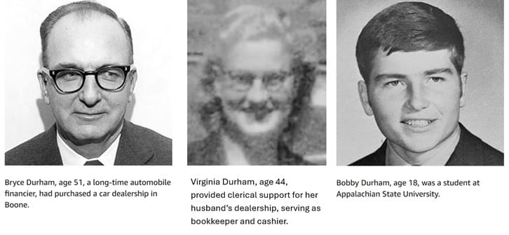 I first heard of this 1972 case only a few years ago via an episode of the excellent The Trail Went Cold podcast. Bryce Durham, his wife Virginia, and 18 year old son Bobby brutally murdered on a snowy night in their home in the small NC town of Boone. Shades of In Cold Blood except the killers were never caught. An unusual aspect of the case is a frantic phone call made during the crime by Virginia to her daughter's nearby trailer home answered by her son-in-law.