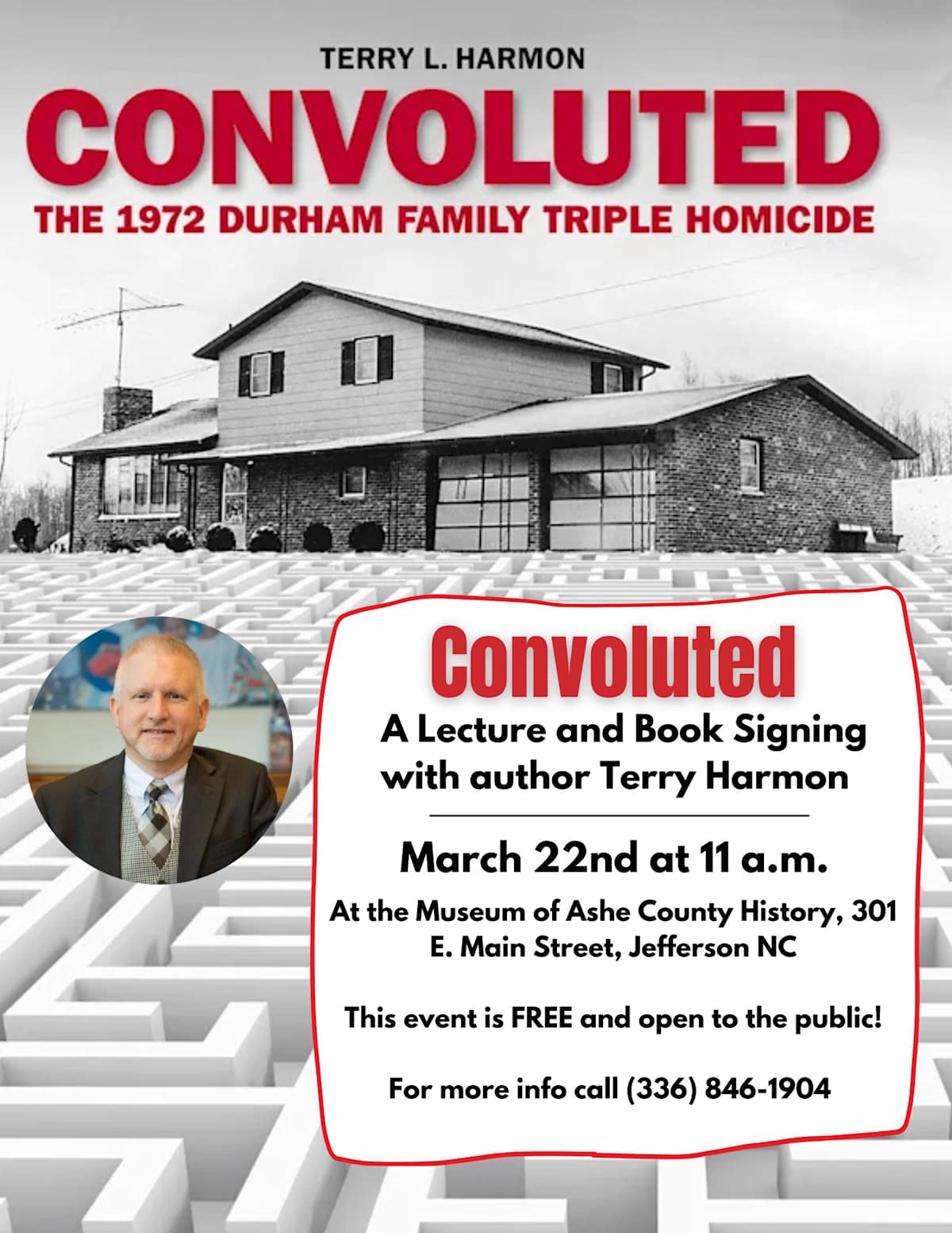 At 11:00 AM, I will be lecturing about and signing copies of my latest book - CONVOLUTED: The 1972 Durham Family Triple Homicide - in the historic 1904 courtroom of the Museum of Ashe County History in Jefferson, NC. This event is free and open to the public.