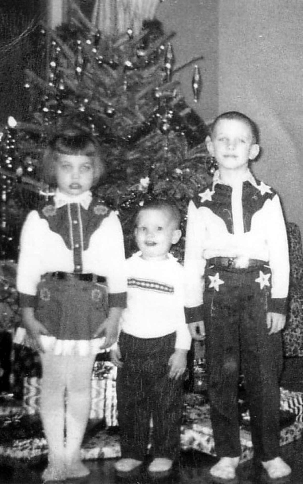 Okay folks, here’s another gem from the Christmas vault a la late 60s. Here you see three American children in front of their bedecked tree, but me thinks there is more to the story. First, I (the child in the middle) apparently failed to receive the cowboy attire memo. That aside, judging by my wild-eyed expression, I may be a little inebriated. I’m pretty sure I was on the bottle till I was about five, so I could very well be high on Sealtest, or perhaps, in order to induce nap time, my mom may have slipped me a bit of the illicit hooch that our neighbor obtained for her from our local jail for use in her rum balls. Meanwhile, my sister has clearly become a Zombie. In our defense, if you saw yesterday’s post and the picture of our frightening encounter with so-called “Santa Claus,” our conditions are obvious after-effects – me taken to drinking and she joining the walking dead. My brother, however, was spared that photo op with Krampus, so here, he appears to be well-adjusted, ready and able to barrel race at will.