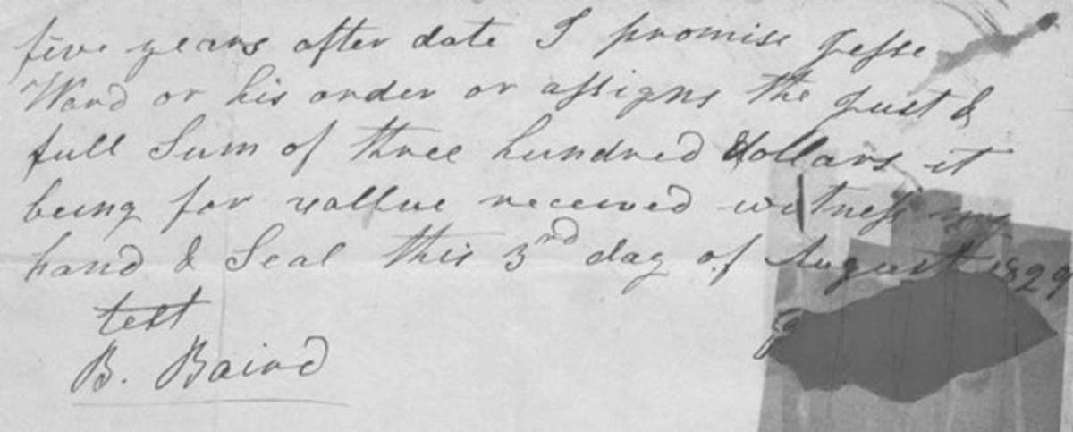 Baird also testified that he was present at the execution of a deed of conveyance from Jesse Ward to James Ward in 1829, and that James gave Jesse a note in consideration of the purchase money, which was $300. [Later, as a recalled witness, Baird further stated that James had actually been in possession of the land before the contract was made between him and Jesse, but he did not know for how long. Baird also testified that, at the request of the parties, he had written the deed of conveyance between Jesse and James as well as the note or bond. In fact, the actual note was produced and is the image accompanying this story.] Baird did not recollect any conversation between him and the Ward brothers at the time of the deed’s execution concerning the contract being conditional or the land being reconveyed to Jesse if James failed to pay for it within a certain timeframe. Baird stated that he had known Jesse Ward since Jesse was a child and had known him to be of sound mind and discretion and considered him to be a man competent to dispose of his property, make contracts, and transact the common business of life.
