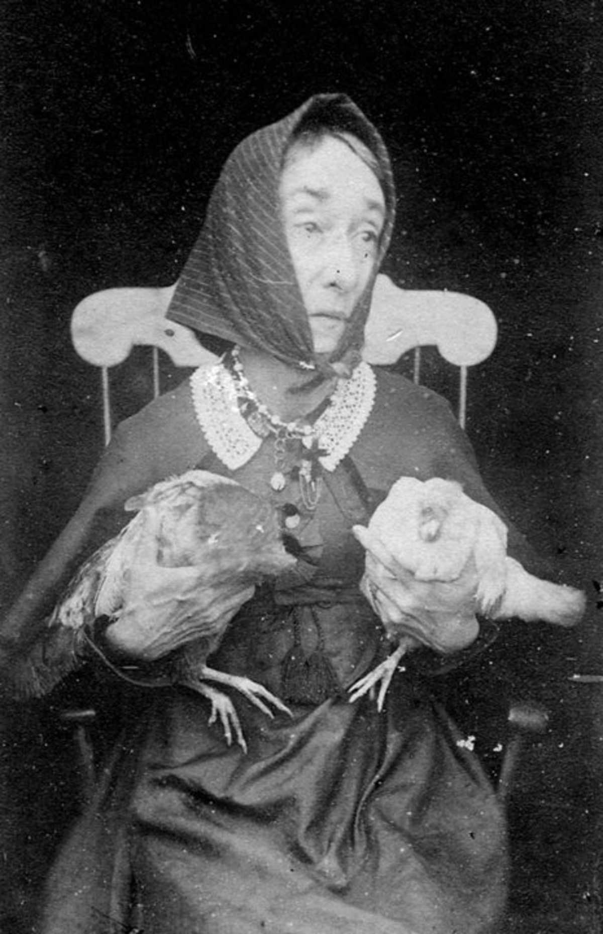 As many of you know, genealogy has been a big interest most of my life. This week I learned that this lady, Nancy Luce (1811-1890) of Tisbury, Massachusetts, is a distant cousin of mine. Described as “a strange woman who exalted barnyard fowl to the level of human intelligence and lived and died with hens as her sole companions far removed from all mankind, she shared her home with her feathered friends, and when death severed the tie between them she gave them a decent burial in a graveyard of their own, hard by her dwelling, where she had marble slabs erected to their memory to mark their resting places. All of her hens were given wonderfully fantastic names [e.g. Teedie Tainie, Letoogie Tickling, Tealsay Meedoolsay, Levendy Ludandy, Tweedle Tedel, Bebee Pinky, Beauty Linna, and Ada Queetie], and were not only the objects of her daily affection and care, but the theme of her writings.” According to one tale, “after the death in quick succession of her nearest relatives she shut herself up with a goat as a companion and when the creature died her wildy extravagant grief was something strange to see. She turned for solace to her hens, never quitting their society." She was also described as “a quaintly pathetic and interesting personality” who “was an attraction to every curious sight-seer who visited the island of Martha’s Vineyard. Her isolated home became a place of pilgrimage for distinguished men as well as idle tourists.” Pictures of her, her hens, and her lonely home adorned Martha’s Vineyard guide books. There was much speculation as to whether Nancy was thoroughly demented or had wit enough to turn her condition, the unchosen fame thrust upon her, into a source of revenue, eking out a livelihood for herself and her hens by selling photographs and her writings to her unbidden guests. Her writings were a reflection of her soul, and a dozen little pamphlets were printed at intervals for sale to visitors. A complete edition or her works were collected and printed in 1888. Nancy sometimes underwent malicious teasing from visitors and the mad pranks of island youth. She was a pious woman and physically frail, said to have lived only on the milk from her Jersey cow, which she named “Susannah Allen” and referred to as “the nicest cow I ever knew.” She often emphasized her desire to be buried with her hens, and she once wrote that as soon as she died, her neighbor “must chop of [sic] every head of the hens, quick and short, put them out of misery quick. They must not suffer no sufferings, nor crueld in no way, nor mourn for me, this must be seen to.” She even asked that the bones of her hens be carefully taken up and placed in her coffin with her corpse, up against her heart.