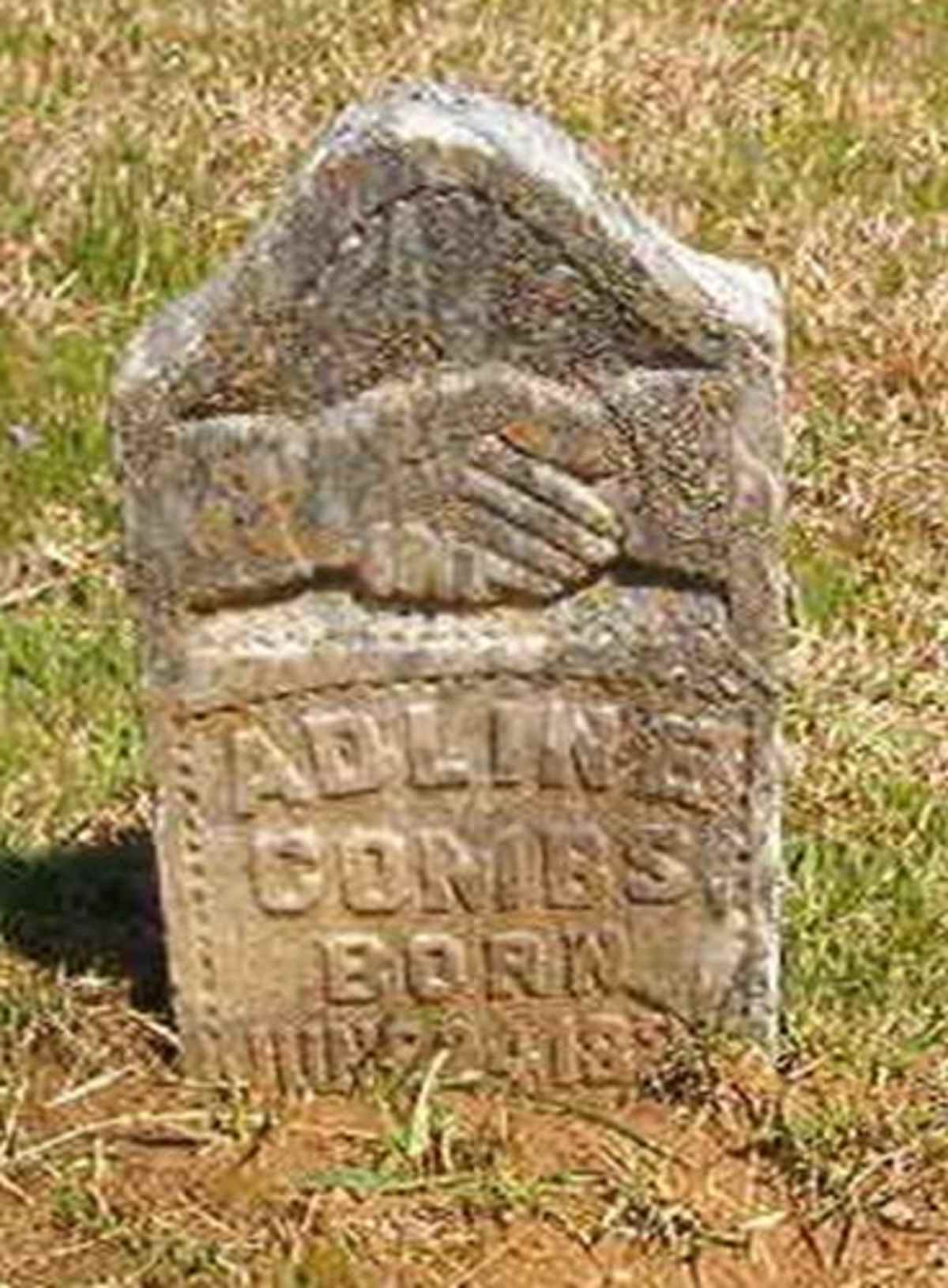 On Adeline’s tombstone, carved just above her misspelled first name, is a pair of clasped hands, which traditionally symbolizes a final earthly farewell and/or a heavenly reunion. In light of her tragic matrimonial saga, however, these hands strike me as a testament to a union that attempted but failed to relieve two people’s desperation – that of Aunt Adeline seeking companionship to assuage her loneliness, and that of Tillett Combs, eager to provide a home and secure a future for his motherless brood.