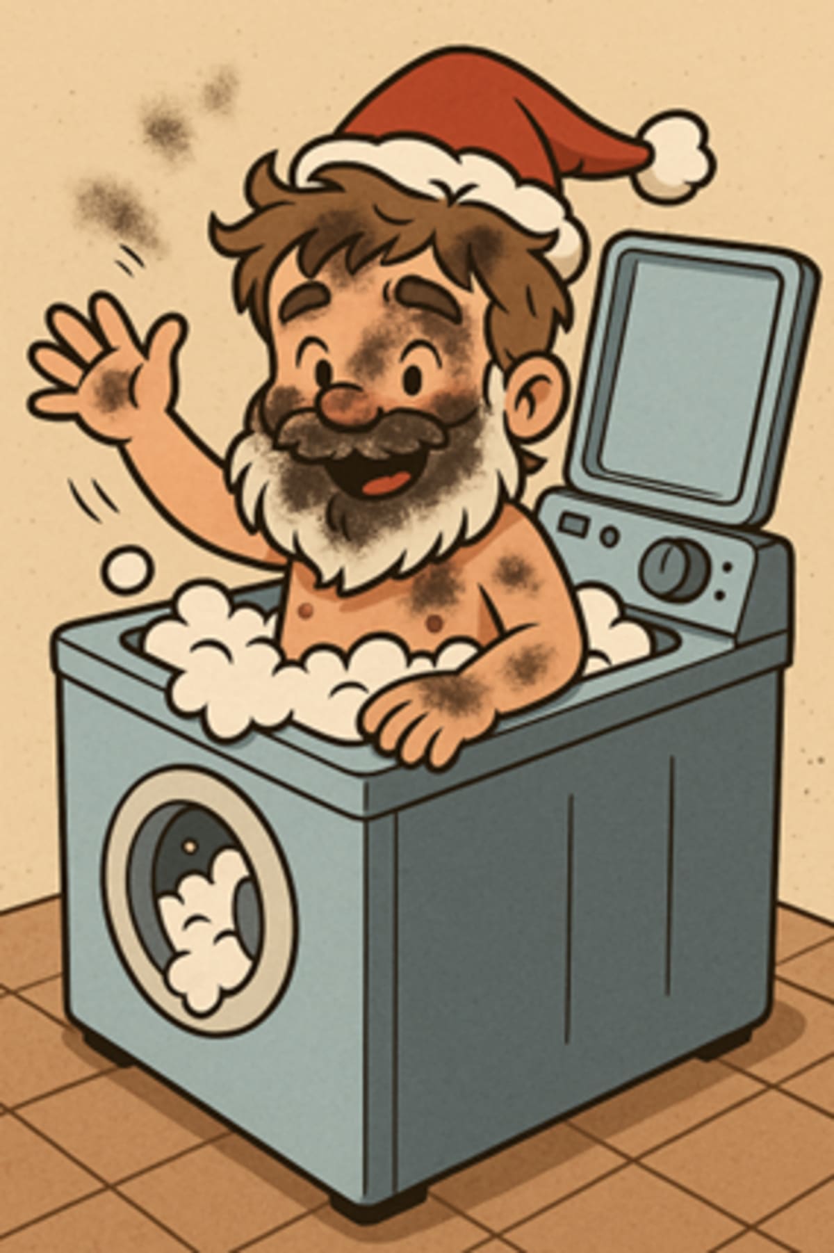 “When I got outta there, it was snowin’ so hard you couldn’t see a thing – darker than a pile of black cats. Well, I worried about how I was gonna find my way home, and I happened to think of Rudolph’s nose. So, I went around, switched it on, and it was as light as could be. So, I headed out for home. I got in about daylight, and my mother said, ‘Santa, what is the matter with your hair and beard?’ I had it full of soot. She said, ‘We’ll have to wash that out of there.’ So, she mixed up a potion of some kind. I don’t know what it was. It might have been some that stuff Eddie Albert and Arthur Godfrey advertise – maybe even some of Rosemary’s stuff could have been mixed in it.* I don’t know what it was, but she put me in to soak and set the thing on that floatin’ action. Well, it ran so long and kicked off; I was still a-floatin’, but I had almost quit actin’. She got me out and ran me through the dryin’ machine, and when I got out of there, my hair and beard were as white as snow, and it’s been that way ever since. But I kind of like it; it’s a lot of fun.